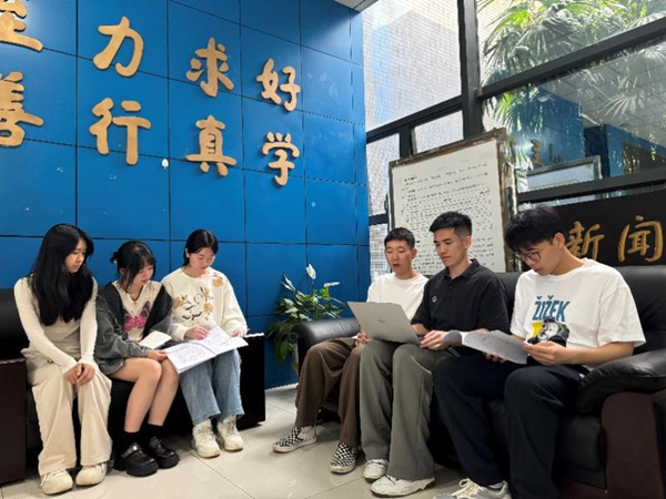 學生“記者”研讀模擬發布會相關材料。重慶大學供圖