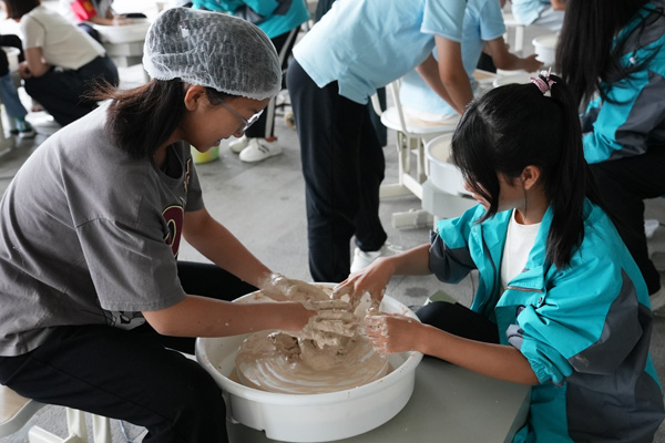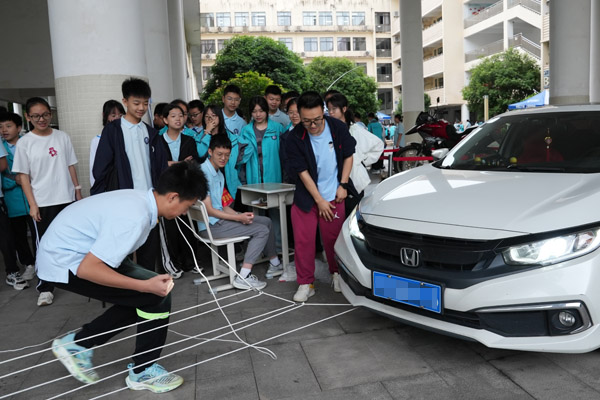 3D打印、機器人等現代科技發展的豐碩成果是孩子們關注的焦點,陶藝、中醫、投壺、活字印刷、艾草香囊等傳統技藝同樣也吸引著學生的興趣,孩子們在寓教于樂中真切地體會到了科技帶來的魅力。在現場,人氣最高的屬“牙齒拉車”“陶藝制作”“人工智能AI音樂制作”三個活動區域?!把例X拉車”,顧名思義即用“牙齒”去拉動一輛汽車。孩子們要“戰勝”的“對手”是一輛重約1.5t,即3000斤的家用小汽車,現場學生們的第一反應便是“難道不會把牙崩了嗎?”原來,物理組的郭鵬老師是利用了“滑輪組可以省力”這一初中物理原理,讓拉動小汽車的所需之力變為原來的1/54,以小克大,以弱勝強,以牙拉車,看似不可能完成的挑戰也能輕松拿下。在“陶藝制作”區,同學們圍攏在拉坯塑形工具旁,觀摩聆聽西南大學專家的示范和講解,之后,大家紛紛上手實踐,感受陶藝這一古老文化的魅力。在AI作曲區,音樂組的楊雪老師帶領同學們為西南大學附屬中學建校110周年校慶寫下發自肺腑的歌詞,通過AI技術創作各種曲風的樂曲,為校慶獻上一首首優美動聽的旋律。