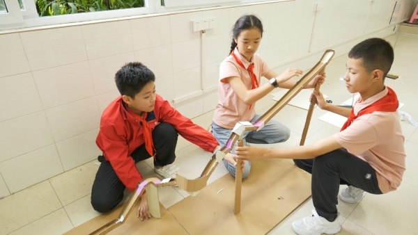 “涉及建筑、橋梁、道路等諸多知識點的摸索?!痹趫F體項目“過山車”區域,孩子們正利用廢棄紙板,搭建可供球形物體滾動的下滑式車道。負責老師介紹,將從設計結合的合理性、制作用料的環保性、團隊分工合作進行綜合評分排名。