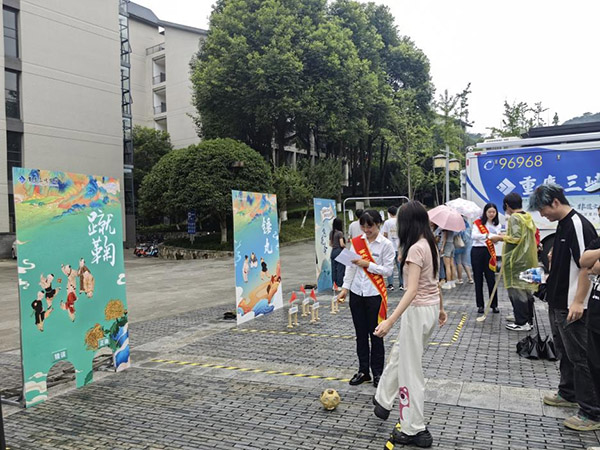 除了金融知識宣講,活動現場還設置了非遺文化體驗區。這里不僅有印有“守好錢袋”“慧眼識騙”“謹慎轉賬”等金融知識標識的拓板供學生們親身體驗,還有現場繪制的非遺糖畫、推拿等中醫非遺養生項目。此外,該行還設置了融合金融知識教育的蹴鞠、捶丸等傳統游戲互動環節,學生們參與游戲闖關即可贏取非遺文化周邊產品,提升了活動趣味性。