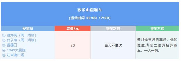 為滿足游客出行,歌樂山直通車線路線上購票更方便,設有渣滓洞、磁器口等站點,線路詳情如下: