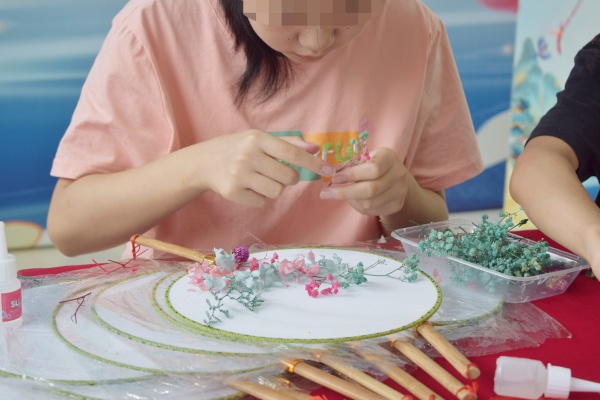 古風團扇DIY環節更是受到參與者的歡迎。成功完成穿針乞巧任務的患者朋友,都可以免費體驗制作古風團扇的神奇過程。在專業老師的指導下,他們挑選著五彩斑斕的永生花,小心翼翼地粘貼在團扇上。最終,每一把團扇都成為了一件獨一無二的藝術品,承載著他們對傳統之美的獨特詮釋。