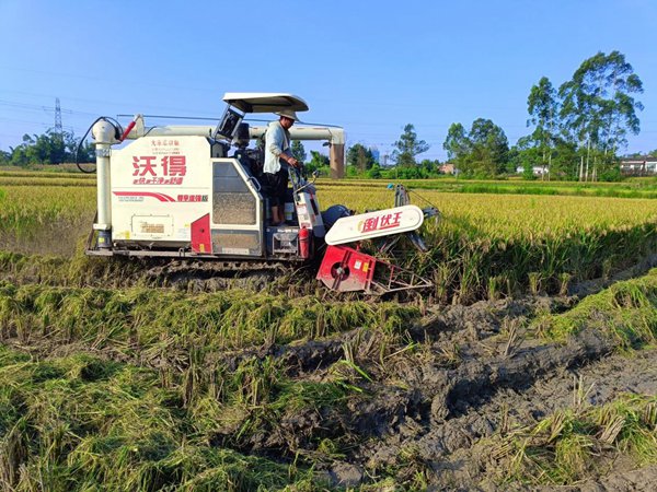 連日來,在重慶市長壽區青云村、利明村和沙河村,收割機開足馬力穿梭田野間,收割、脫粒一氣呵成,轟鳴聲中,一片片稻谷被“收入囊中”。
