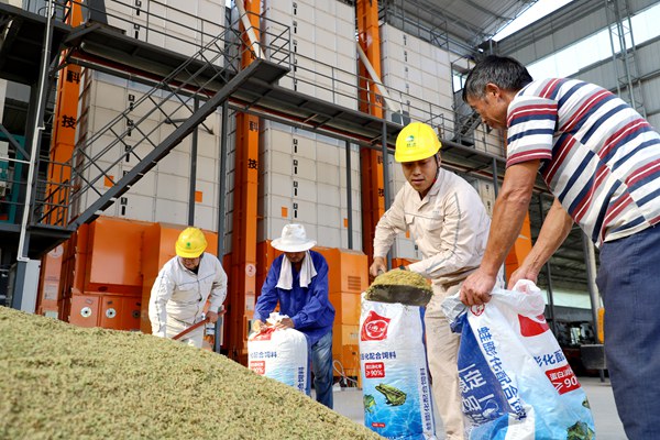 8月22日,在重慶永川雙石鎮腳盆井村農機專業合作社,烘干機正在全速運轉,剛剛收割脫粒的稻谷經過烘干后達到了入庫標準,工人們忙著打包封袋儲存?!暗竟冉涍^烘干可以提高品質,確??焖偃霂?。這幾天烘干機基本上就沒停?!痹摯宕逯Р繒洀埲蕶喔吲d地說。