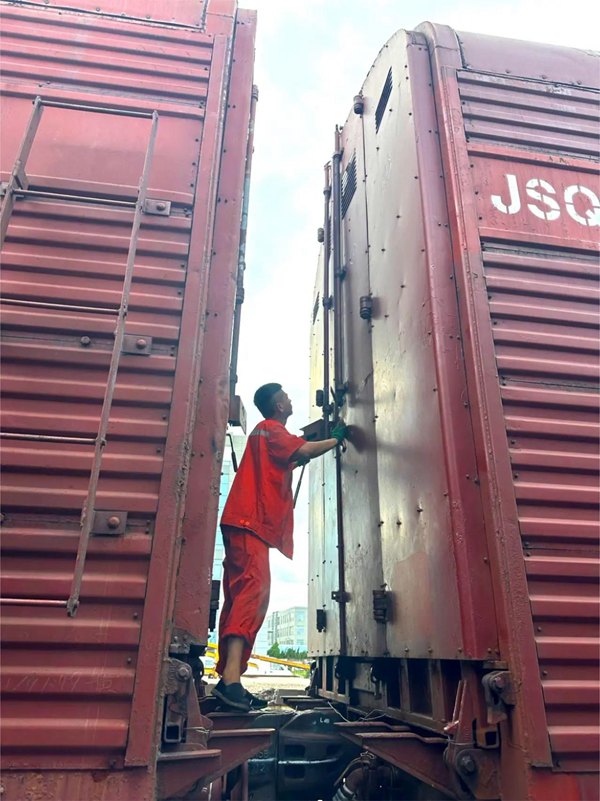 掃描裝車后的汽車進入jsQ6車箱,重慶物流工作人員人工開箱和關箱,進行夏季安全檢查。三羊馬物流供圖。
