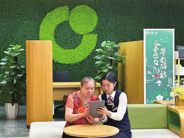 中國人壽客服人員為老年客戶講解尊老版壽險App使用
