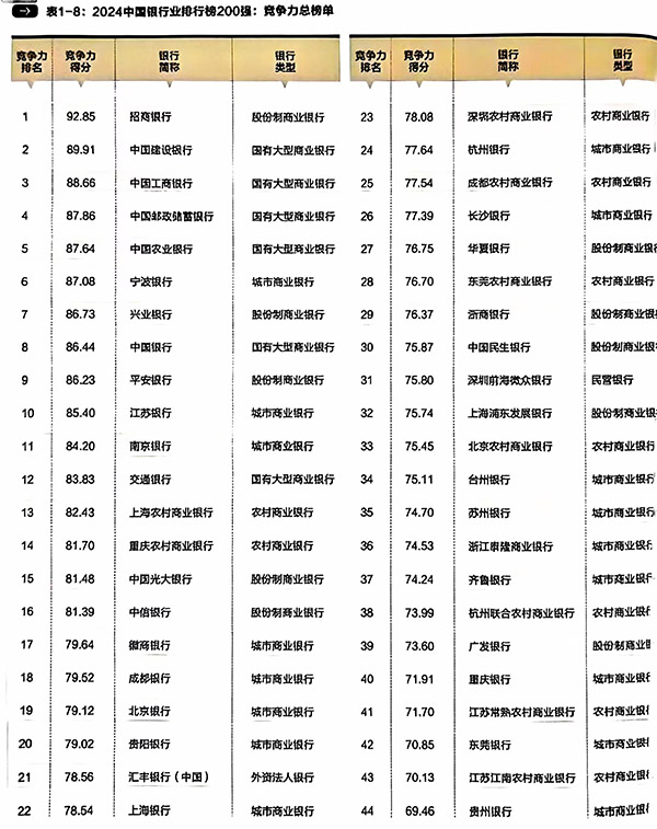 《清華金融評論》發布的“2024中國銀行業排行榜200強:競爭力總榜單”部分排名。重慶農商行供圖