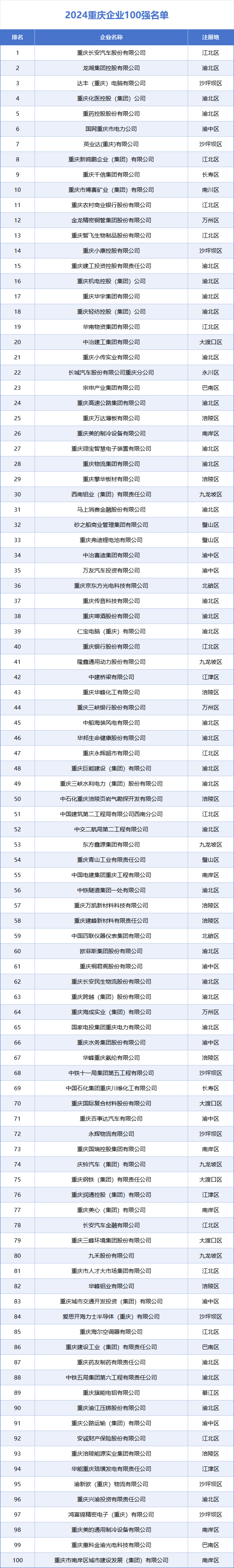 據了解,2024重慶企業100強是根據中國企業聯合會制定的中國企業500強的標準為基礎,經企業自愿申報,按照2023年企業營業收入從大到小依次排序產生。