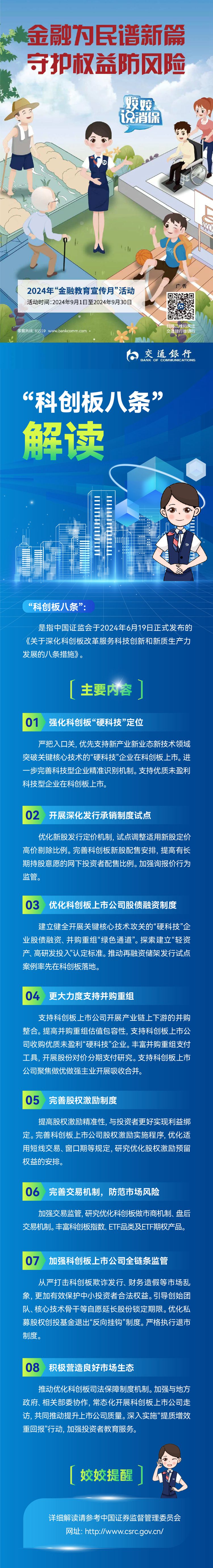 9月期間,交通銀行重慶市分行啟動2024年“金融教育宣傳月”活動,圍繞“金融為民譜新篇,守護權益防風險”主題,推出“姣姣說消?!苯鹑谥R小課堂,通過案例、長圖、短視頻等形式,幫助公眾了解金融知識,認識金融風險,切實保護金融消費者合法權益。本期分享主題為《一圖讀懂“科創板八條”》。(交行重慶市分行供圖)