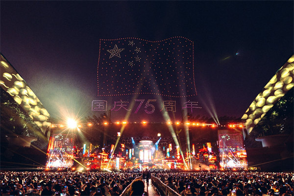 重慶站的特別之處在于,首次引入了3D無人機表演。千架無人機在《借過一下》《燈火里的中國》和《Wala li longla》三首歌曲中,飛舞于山城夜空,繪制出國旗、演唱會元素以及衍生IP“嫑嫑”的形狀,點亮了整個夜空。這是重慶首次在演唱會中獲批使用無人機表演,展現了科技與音樂的創新融合。