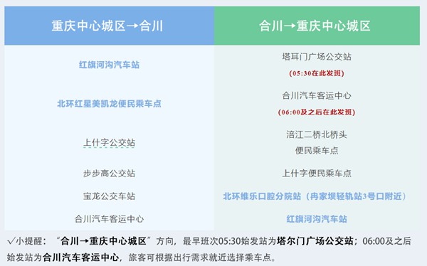 多站點???,出行更隨意。渝合同城巴士往返分別在重慶中心城區設2個上(下)車點、在合川城區設4個上(下)車點,其站點詳情如下: