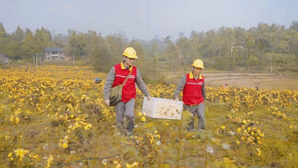 電力工人協助村民打包金絲皇菊。國網重慶永川供電公司供圖