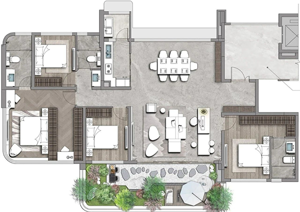 為了讓室內功能性更強,業主可以進行超級主臥套房、次臥聯通花園、超大客廳等多元設計組合,讓以改善需求為核心的四代宅,為業主提供對理想生活的無限想象。