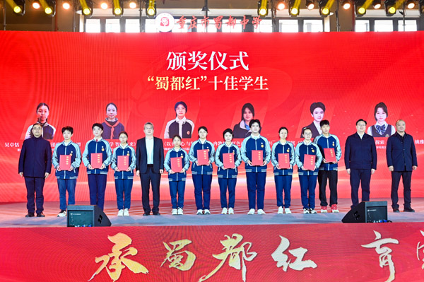 為引導鼓勵師生在傳承紅色基因、弘揚革命精神方面的突出貢獻,學校在校慶之際特別設立了“紅色傳承之星”——“蜀都紅”十佳學生、十佳教師和黨員示范班等獎項,與會領導為獲得榮譽的師生頒發榮譽證書。