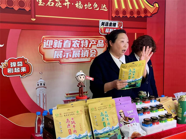 現場,搭建起了一間洋溢著濃濃年味的直播間,主播們通過鏡頭,向網友們詳細介紹色達土豆、青稞啤酒、牦牛肉干等特色產品的種植環境、制作工藝及其營養價值。