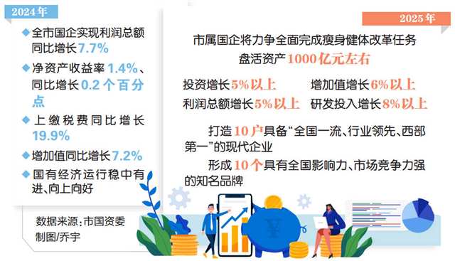 2月13日,2025年市屬國企負責人會議在市國資委舉行。據了解,2024年,全市國企實現利潤總額同比增長7.7%,凈資產收益率1.4%、同比增長0.2個百分點,上繳稅費同比增長19.9%,增加值同比增長7.2%,國有經濟運行穩中有進、向上向好。