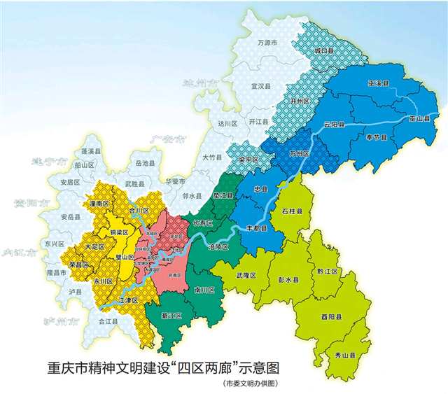 全市精神文明建設工作大格局的總體布局是“四區兩廊”,即因地制宜、分類施策,統籌推進中心城區城市文明示范區、渝西城市文明涵養區、渝東新城城市文明涵養區、渝東南文明鄉風示范區,推動三峽庫區沿江文明走廊建設,協同四川省委宣傳部,進一步打造川渝新時代文明實踐“一廊四帶”(覆蓋川渝30個區縣)。