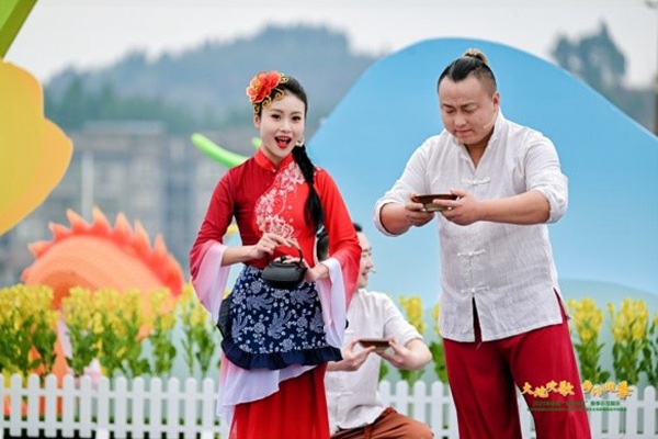 璧山區文化館帶來的傳統鼓舞《璧山鼓》,熱情激昂的鼓聲敲出了璧山人民的精氣神,拉開了展演序幕。南川區的山歌表演唱《妹兒端出干勁湯》、江津永興鎮的市級非遺“永興吆喝”《火紅的日子跳起來》、市級非遺“打蓮簫”配上潼南特有的女子獅舞,民俗舞蹈《蓮簫獅語》讓人耳目一新、諧劇《下一站》講述一段程序員的輕軌奇緣,帶給現場一片歡笑聲,還有展現榮昌美食的《榮昌好吃嘴》,體現春天踏青好時節的《百花齊放》,精彩節目一個賽一個,《幺妹一枝花》《龍騰盛世》……臺下掌聲不絕。