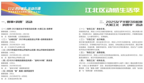 近年來,江北區體育旅游消費不斷興旺,刺激消費動作頻頻“破圈”,市民消費打開方式不斷“翻新”。 本次消費季活動聯動推出“5+4+4”體育消費惠民活動:“賽事+消費”5大配套活動、“美食樂享、出行暢游、消費促銷、時尚生活”4大主題活動和4條江北區體育旅游精品線路。通過“政府搭臺、企業唱戲、全民參與”的創新模式,將體育賽事、文化旅游和休閑消費等元素融為一體,構建“體育+”消費新場景,激發群眾體育消費新活力。