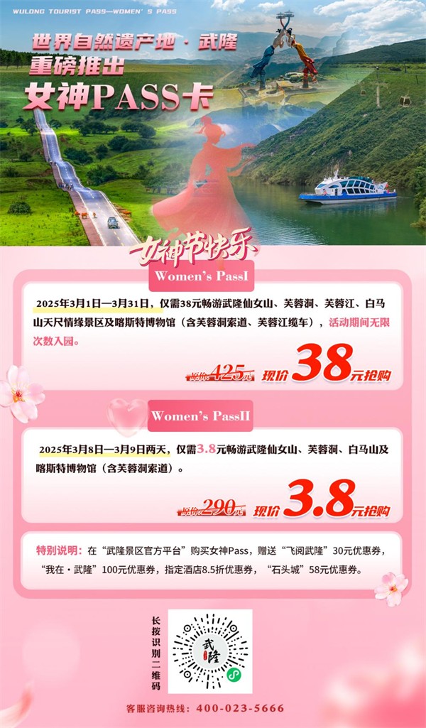 武隆景區針對全國游客特別推出了超值的女神PASS卡,僅需38元,2025年3月1日至31日,就能無限次暢游仙女山、芙蓉洞(含芙蓉洞索道)、芙蓉江(含芙蓉江纜車)、白馬山天尺情緣景區及喀斯特博物館。