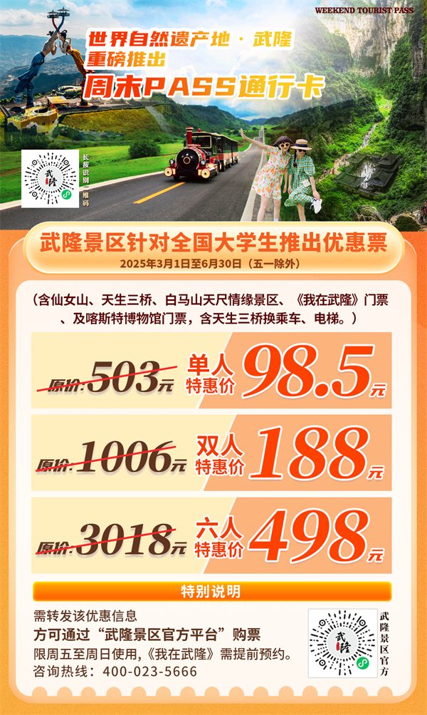 武隆景區針對全國大學生推出了周末PASS通行卡,2025年3月1日至6月30日,單人、雙人及六人套餐,折扣低至1.7折,周五、周六、周日均可使用(五一假期除外)。(來源:游在武?。?/p>
