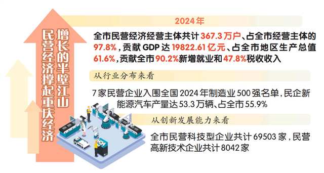 “當前,重慶先后涌現出了博賽礦業、智飛生物、小康控股等一大批具有全國影響力的民營企業?!笨登f透露,2024年,全市民營經濟經營主體共計367.3萬戶、占全市經營主體的97.8%,貢獻GDP達19822.61億元、占全市地區生產總值61.6%,貢獻全市90.2%新增就業和47.8%稅收收入。