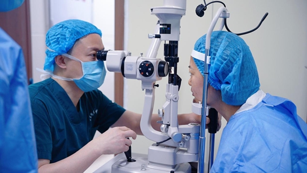 手術前,患者(右)接受眼部檢查。重醫附屬大學城醫院供圖
