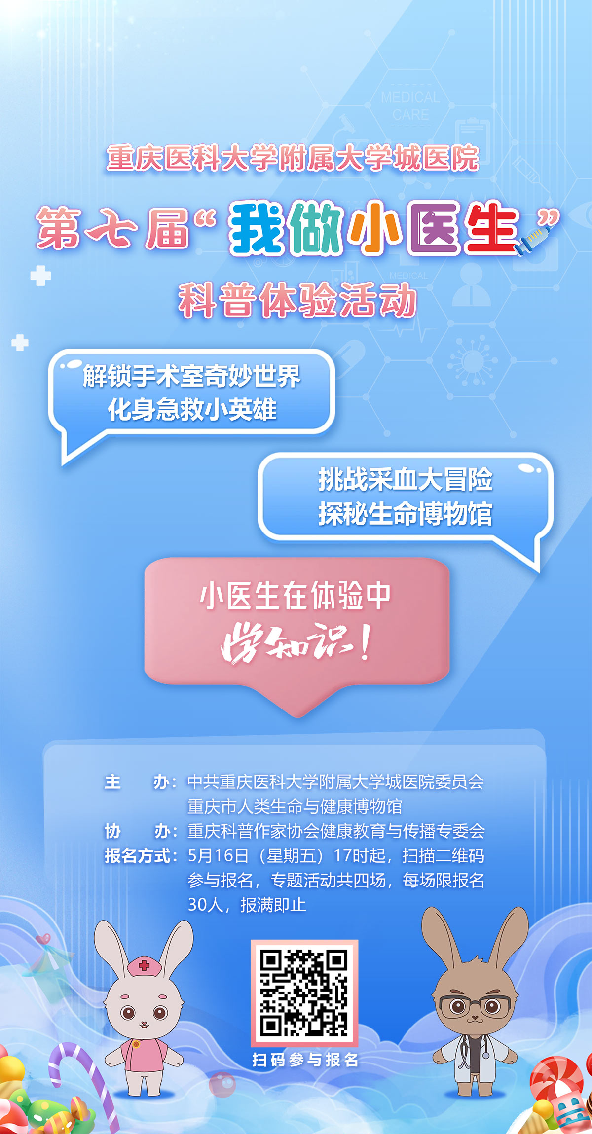 今日,重慶醫科大學附屬大學城醫院與重慶市人類生命與健康博物館主辦的“第七屆‘我做小醫生’科普體驗活動”正式啟動報名?;顒訉⒄心?20名6至12歲的少年兒童沉浸式體驗醫生職業,為孩子們搭建一座了解醫學世界的趣味橋梁。