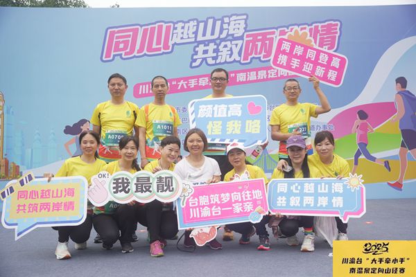 清晨的南溫泉薄霧繚繞,青翠欲滴。隨著一聲清脆的發令槍響,身著鮮艷賽服的選手們從起跑線出發。賽道上,“大手牽小手”的溫馨場景隨處可見:父母鼓勵著稚嫩的孩子,青年攙扶著年長的前輩,兩岸同胞并肩前行。