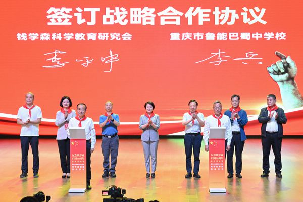 活動中,錢學森科學教育研究會為魯能巴蜀中學授予“錢學森科學教育研究會重慶基地”,并簽訂戰略合作協議。錢學森科學教育研究會名譽會長、上海交大錢學森圖書館館長錢永剛代表研究會向學校錢學森科學館捐贈“兩彈一星”元勛、中國探月工程總設計師孫家棟手模。錢學森科學教育研究會會長李平中宣讀航天英雄楊利偉賀信,寄語青少年們以錢學森為榜樣,追逐航天夢想。
