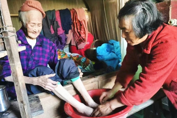 隨著譚興碧年歲漸高,身體活動能力喪失,基本臥床,曹順英和丈夫也日漸年邁??紤]到妻子照顧老人又干農活太辛苦,梁志華決定回家。曹順英感慨:“丈夫回來后,我輕松了許多,但照顧老人的責任一點沒少?!狈蚱薹止っ鞔_,丈夫主抓農活,曹順英農忙時搭把手;家務由曹順英負責,丈夫有空也幫忙。多數時候,曹順英在家專心照顧老人,端屎接尿、翻身換被褥、洗漱梳頭、擦身換衣,梁志華常給老人洗腳,老人若有個頭疼腦熱,他不管何時都背老人去村衛生站看病。曹順英說:“‘婆婆’沒了咀嚼能力,丈夫就常把豬肉剁成肉泥熬粥,一勺勺喂給老人。天氣好時,還背老人到院壩曬太陽?!?/p>