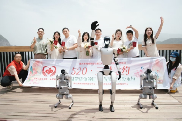活動現場,機器人化身為特別“使者”,為新人送上手捧花與結婚證,帶來充滿科技感的獨特體驗。在巫山縣民政局婚姻登記中心頒證員的見證下,新人們許下永結同心的誓言,定格幸福瞬間。(任美連、董存春)