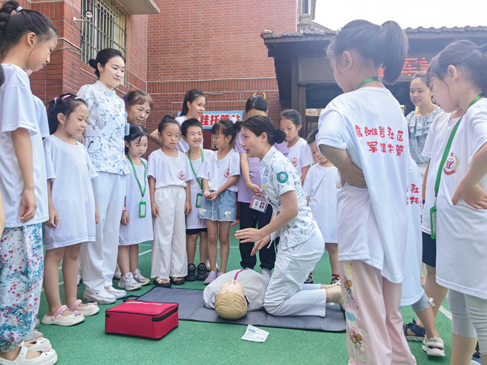 剛結束的體能訓練熱度未消,孩子們又圍在西南醫院急診醫學科主任護師曾冬梅、主管護師王倩和黃祥城身邊,全神貫注地學習心肺復蘇技能。曾冬梅手把手地調整著孩子們按壓的姿勢和力度,知識的種子在指尖傳遞,安全的責任感悄然萌芽。