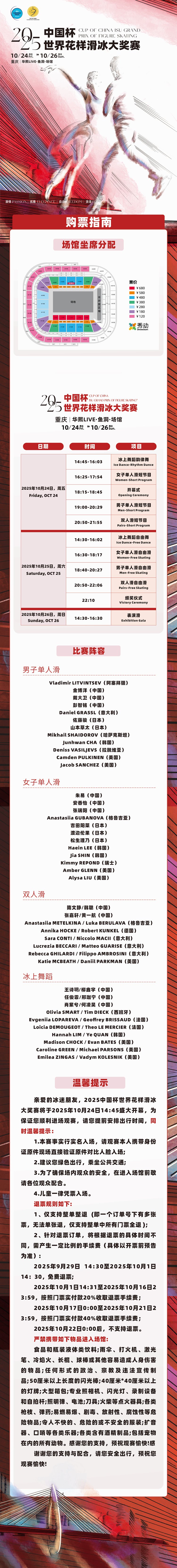 本次賽事在賽程方面節奏緊湊且亮點分明:10月24日(周五)開啟冰舞韻律舞、女單/男單/雙人滑短節目;10月25日(周六)進行各項目自由滑/自由舞的角逐,當晚舉行頒獎儀式,決出最終獎牌歸屬;10月26日(周日)的表演滑則將氛圍推向高潮——選手們將拋開競技壓力,用個性演繹為冰迷獻上“沉浸式藝術秀”。