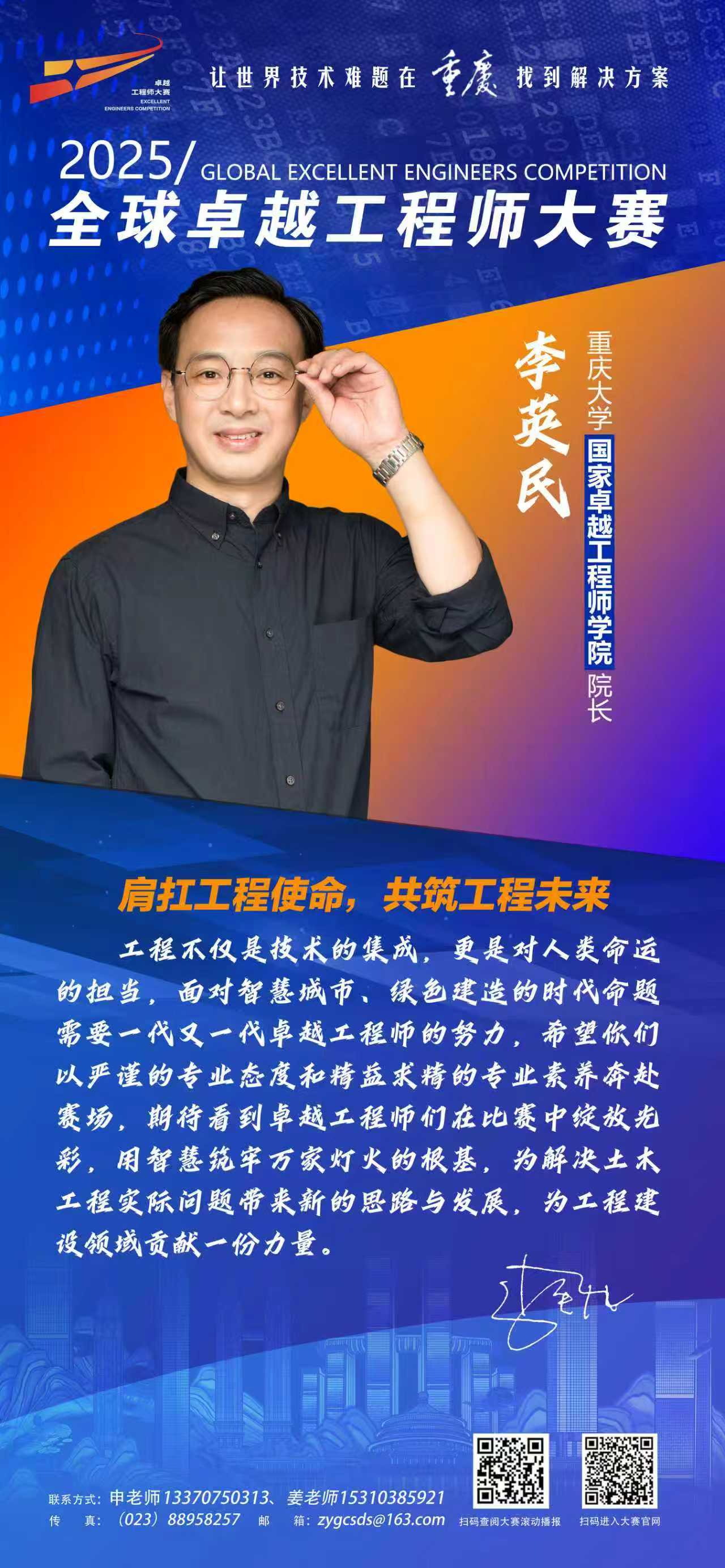 10月22日,重慶大學國家卓越工程師學院院長李英民向全球卓越工程師大賽·2025年度發來推介詞:工程不僅是技術的集成,更是對人類命運的擔當,面對智慧城市、綠色建造的時代命題需要一代又一代卓越工程師的努力,希望你們以嚴謹的專業態度和精益求精的專業素養奔赴賽場,期待看到卓越工程師們在比賽中綻放光彩,用智慧筑牢萬家燈火的根基,為解決土木工程實際問題帶來新的思路與發展,為工程建設領域貢獻一份力量。
