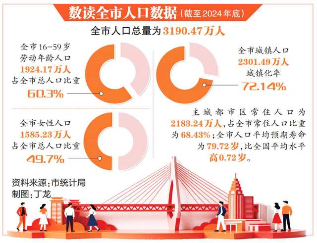“十四五”以來,我市人口分布繼續向城鎮和主城都市區集聚。截至2024年底,全市城鎮人口為2301.49萬人,城鎮化率為72.14%;主城都市區常住人口為2183.24萬人,占全市常住人口比重為68.43%;全市人口平均預期壽命為79.72歲,比全國平均水平高0.72歲。